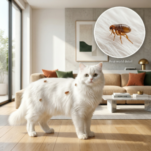 البراغيث حشرات صغيرة جدًا تتغذى على الدم، لكن خطورتها الحقيقية تكمن في سرعة تكاثرها. البرغوثة الواحدة قد تضع عددًا كبيرًا من البيض، وهذا البيض لا يبقى على القطة فقط، بل يسقط على السجاد والمفروشات والزوايا وفرش الحيوان. ولهذا تتحول المشكلة خلال أيام قليلة من إصابة على الحيوان إلى انتشار داخل المكان كله.